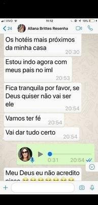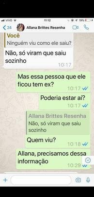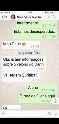 Em mensagens anteriores, enquanto Daniel ainda estava desaparecido, Allana chega a mandar contatos de vários hotéis da região, supondo que talvez o rapaz tivesse se hospedado por lá. Ela disse que estava indo ao Instituto de Medicina Legal (IML), na companhia dos pais, para ver se o corpo encontrado seria o do jogador. "Fica tranquila, por favor. Se Deus quiser, não vai ser ele. Vamos ter fé, vai dar tudo certo", disse à mãe do meia.